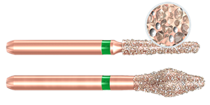 DIAO provides a smooth cut and increased tactile sensation for the operator. The pearls also create a longer life for the bur because there is less sludge buildup during use. Komet also made these burs easily identifiable with a rose gold coating on the shank.